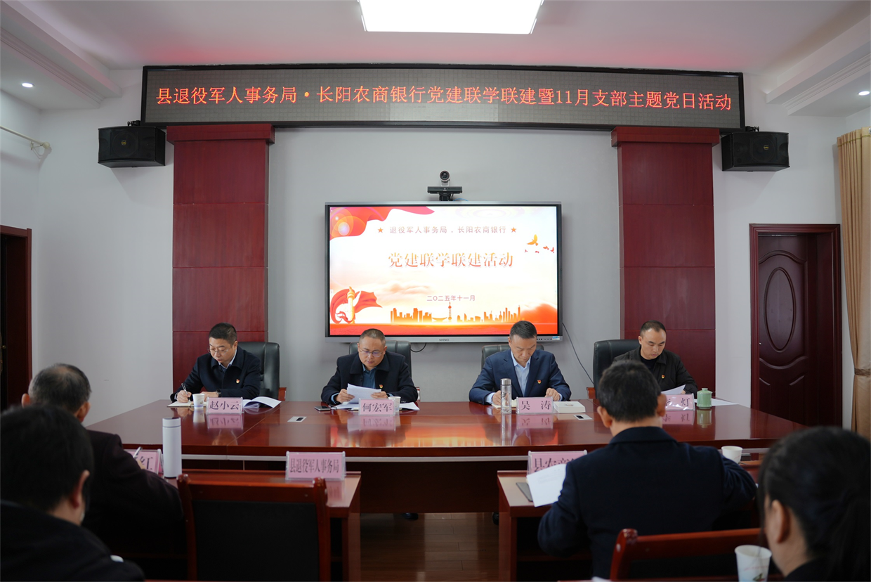 2025年11月27日,长阳农商银行与县退役军人事务局党建联学联建活动在县退役军人事务局6楼会议室开展。此次活动以“党建领航聚合力,拥军优抚谱新篇”为主题,通过深入学习贯彻党的二十届四中全会精神,深化政银协同合作,推动拥军优抚政策落地与金融惠民服务提质。