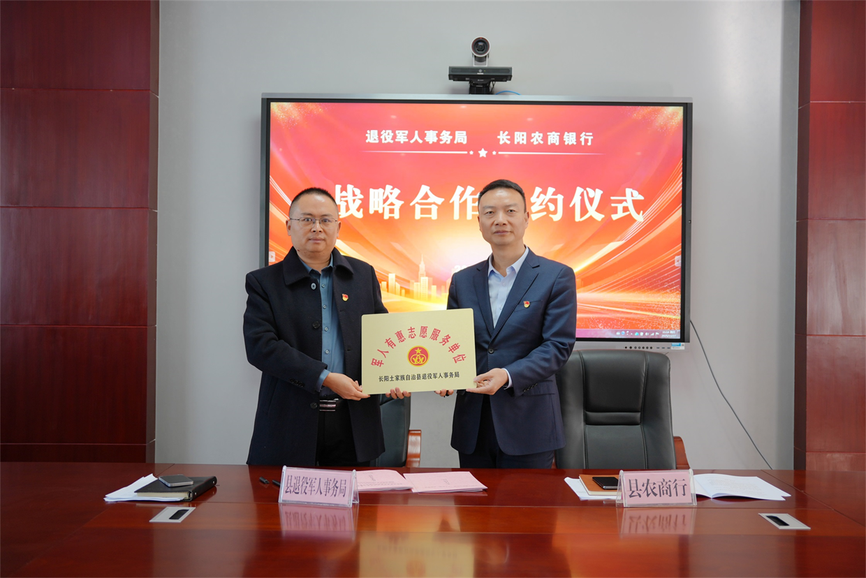 活动现场,长阳农商银行与县退役军人事务局签署了战略合作协议,并授予长阳农商银行“军人有惠志愿服务单位”牌。根据协议,双方将聚焦退役军人服务领域深化合作,强化信息共享,积极宣传推介退役军人的专属优惠金融政策与服务产品;长阳农商行不断优化服务渠道、提升服务质效,以 “拥军优抚” 为核心,提供全方位普惠金融服务。